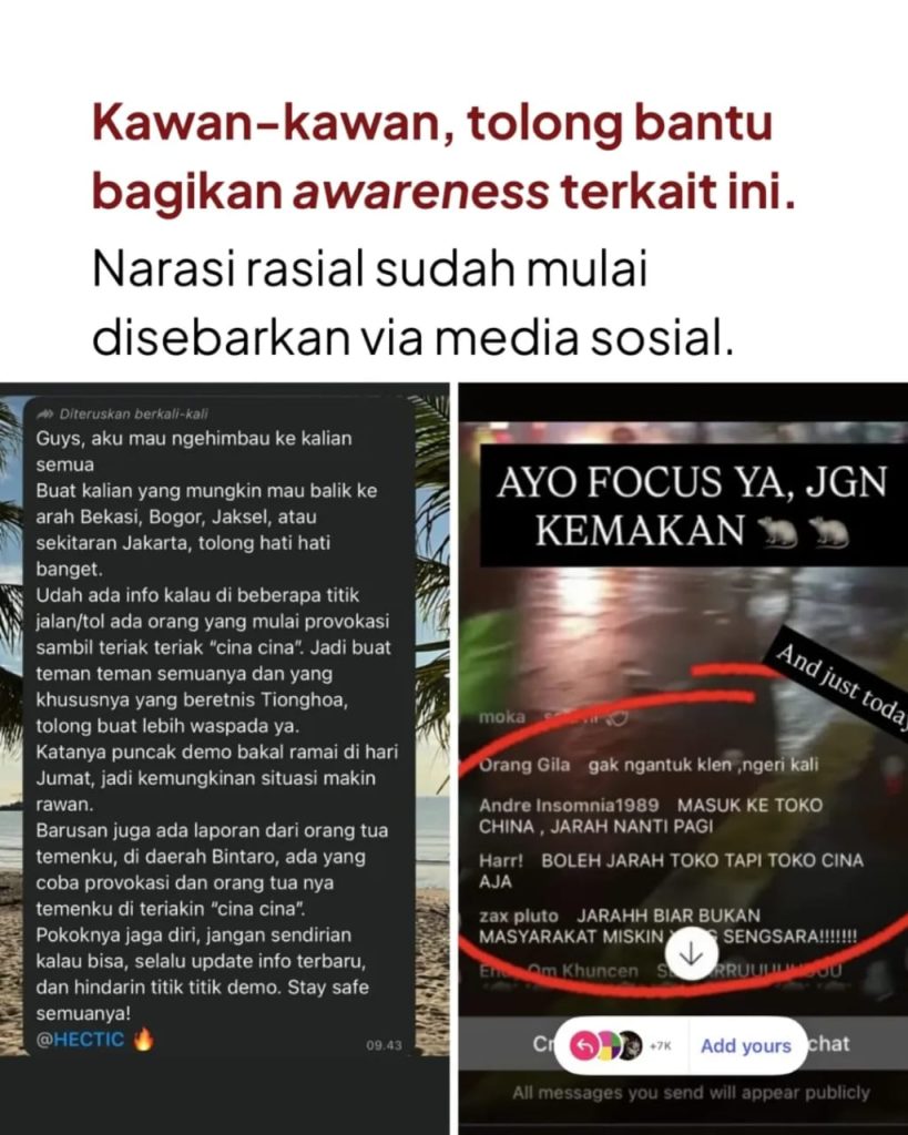 Screenshot pesan edaran melalui WhatsApp pada periode akhir Agustus untuk orang-orang beretnis Tionghoa dan komentar-komentar di Instagram live dengan penggiringan untuk menjarah “China” bertebaran di media sosial. Rupanya, ada yang berusaha membangkitkan narasi lama. Ada yang ingin luka lama itu terulang kembali.