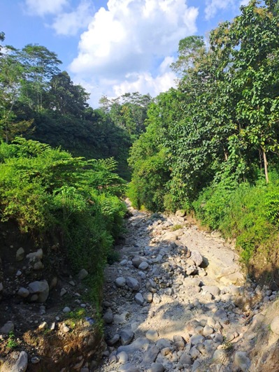 Locus kemudian menuruni tebing, merangkak menuruni jalur bebatuan curam sepanjang sepuluh meter hingga mencapai dasar sungai. Dari bawah, dinding-dinding batu tampak lebih megah dan kokoh dengan pepohonan yang berusaha menutupi luka-luka di tanah. Sampah plastik, sepatu sebelah, kartu tanda anggota Pramuka, hingga tas koyak tersebar mengisi perut sungai yang mengering. Perjalanan sebenarnya baru dimulai dari titik ini.