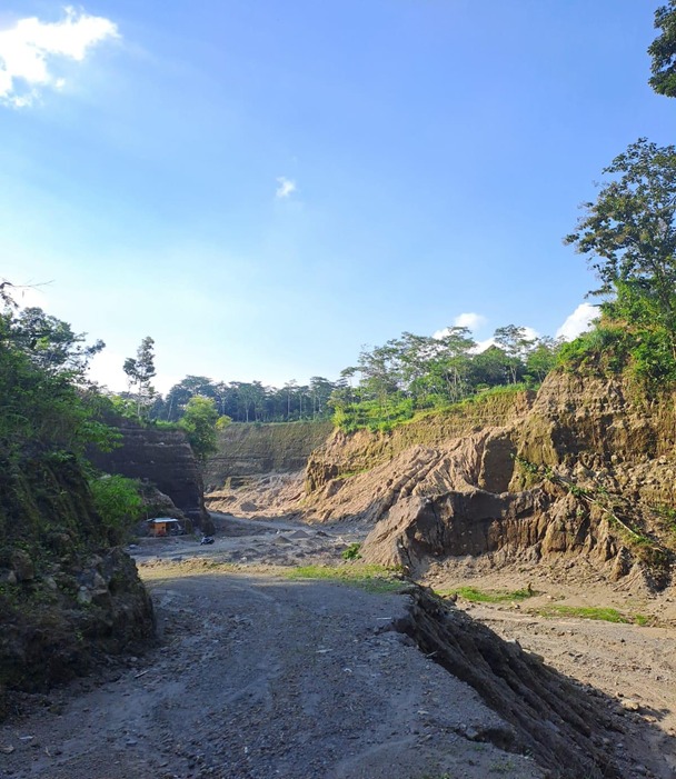 Semakin jauh masuk, bentang alam berubah. Dinding-dinding batu yang semula membatasi di kiri-kanan menghilang; tanah dan batuan sudah habis dikeruk, meninggalkan lereng-lereng curam tanpa penahan akar pepohonan, rentan longsor saat hujan menghujam.